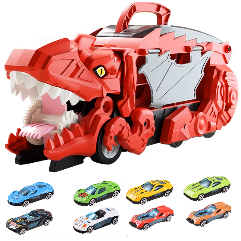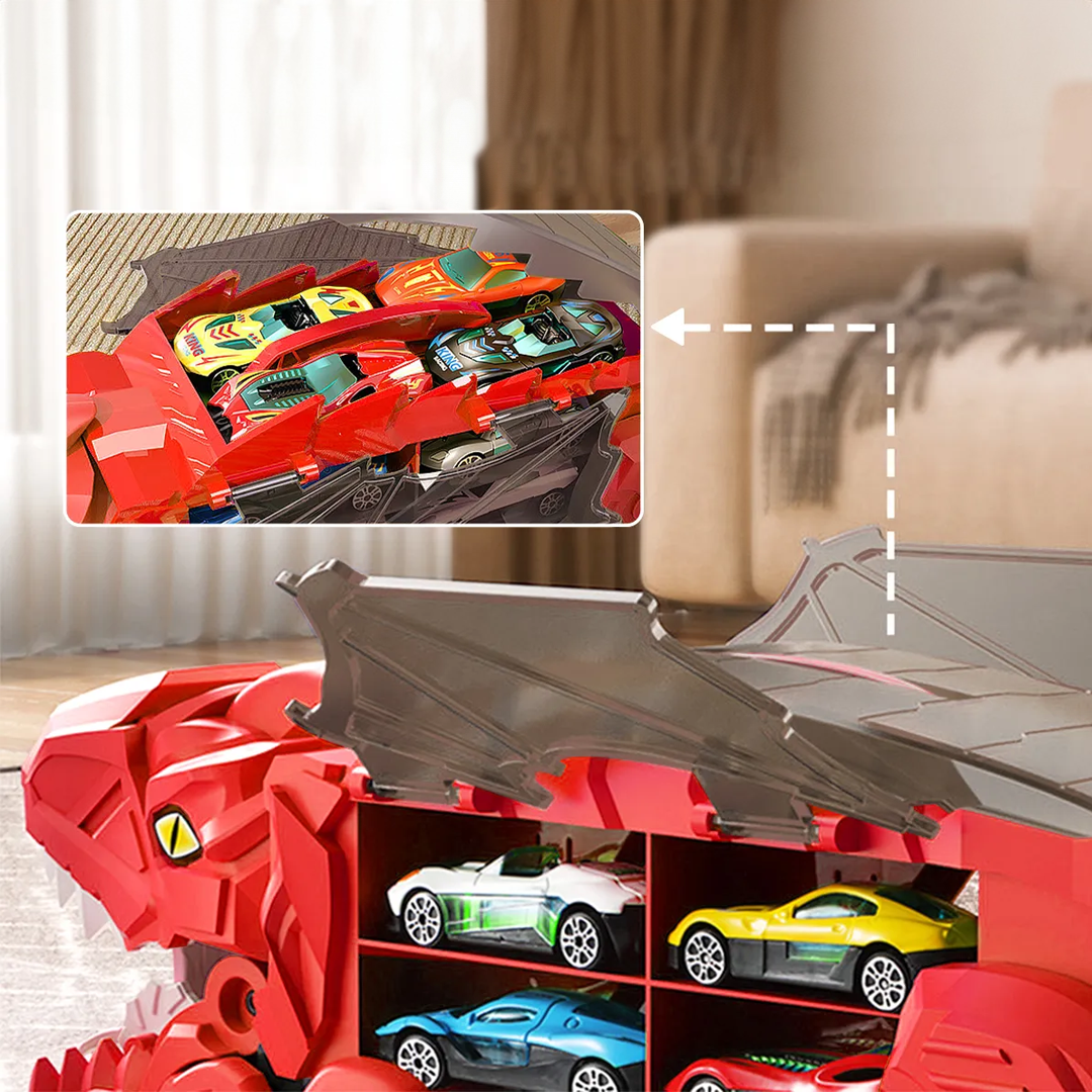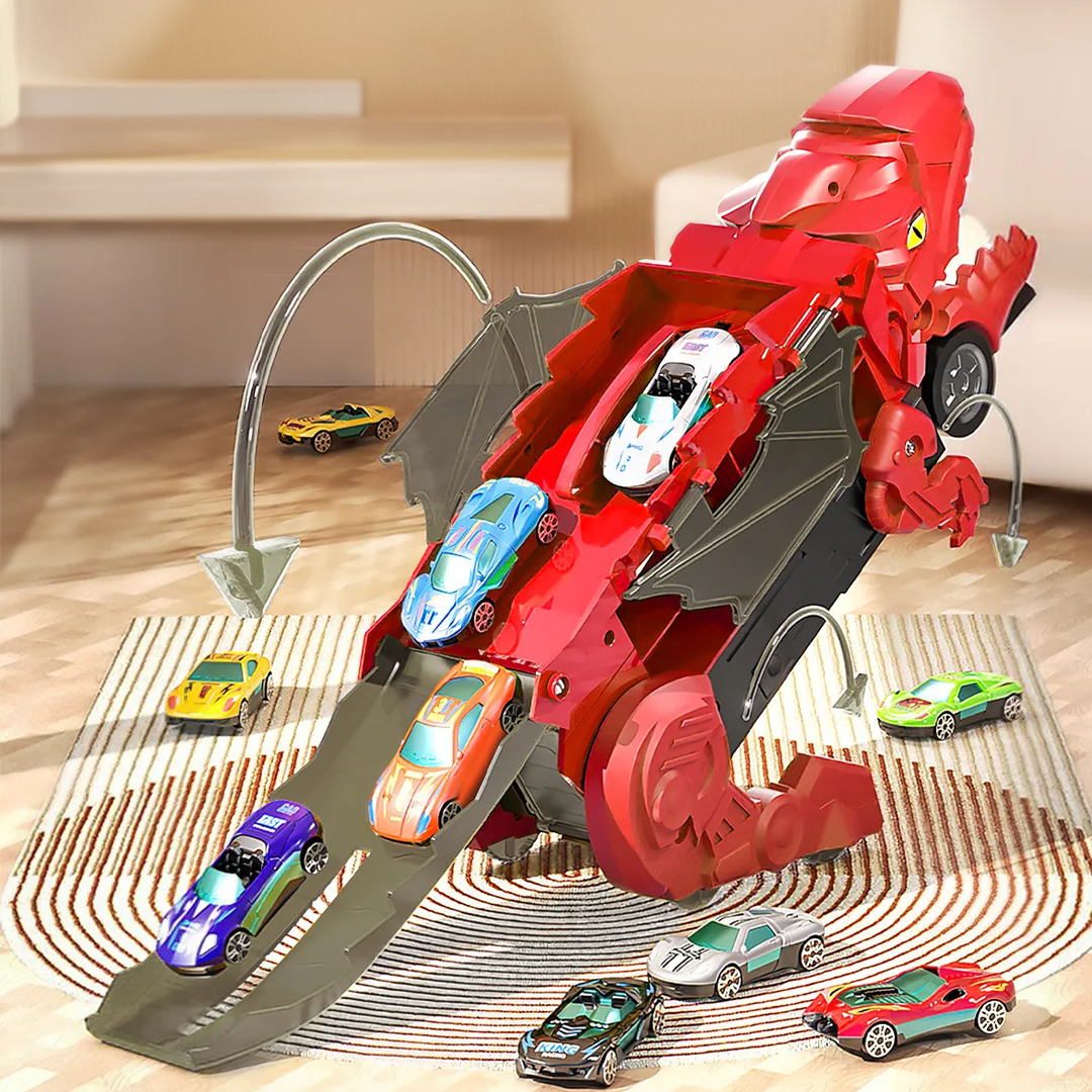 🏁 Dinosaur sa Dvostrukom Trkačkom Stazom: Pretvorite kamion u stojećeg dinosaurusa podizanjem njegovog tela i povlačenjem repa nazad. Dva metalna automobila mogu se takmičiti na stazi – neka pobedi najbrži!