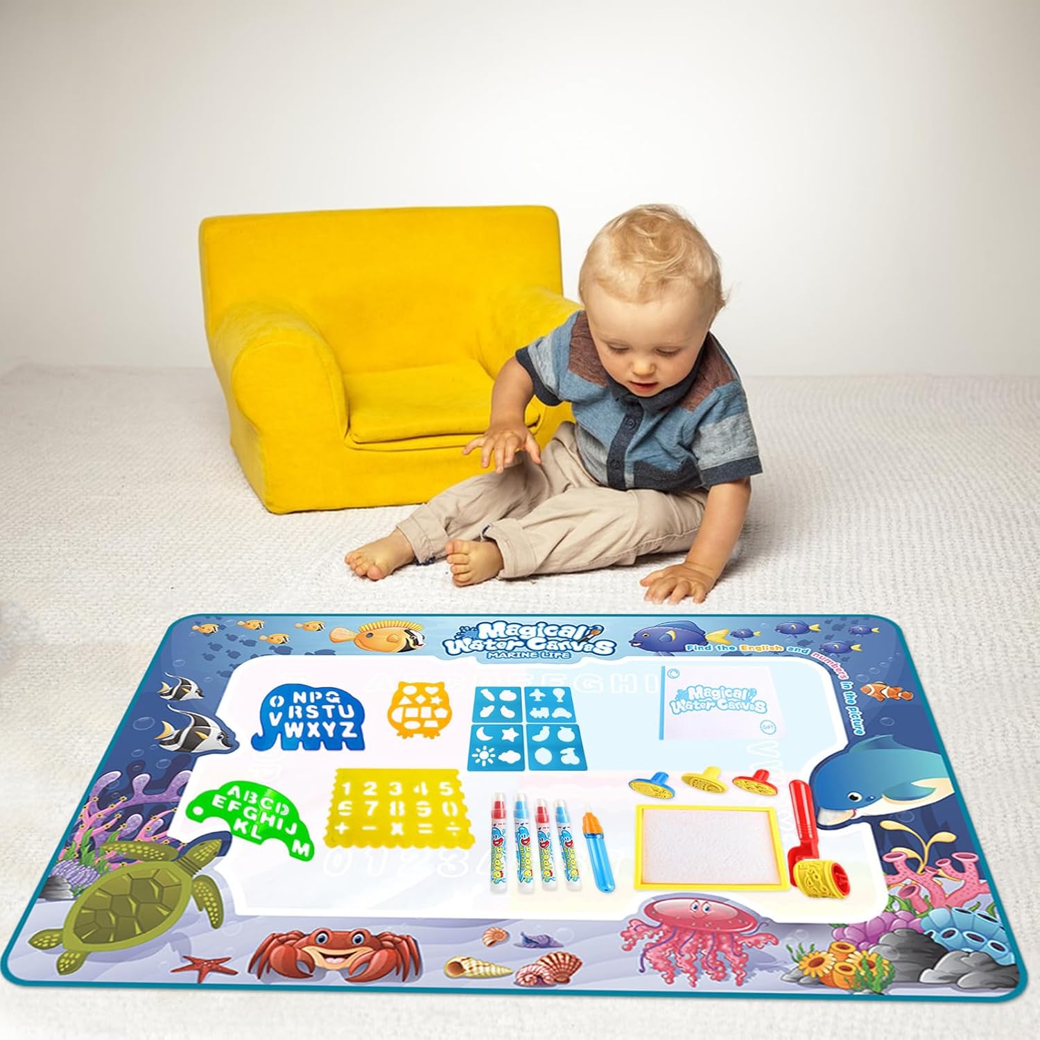 📚 Obrazovni sadržaji: Vodena podloga dolazi sa bogatim sadržajem poput abecede, brojeva i slikovnice sa zanimljivim temama. Deca kroz igru istražuju svet slova i brojeva, razvijajući svoju maštu.