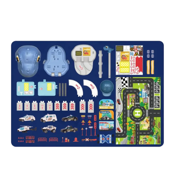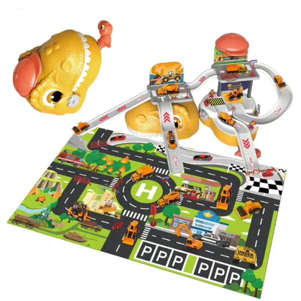 Ovaj kofer transformiše se u preslatkog dinosaurusa i otkriva čitav svet zabave u svom stomaku. Od kompletnog gradića spremnog za vrtoglave vožnje autićima, do policije i parkirališta, ovaj kofer nudi obilje mogućnosti za igru koja podstiče istraživanje, razvijanje fine motorike, koordinaciju ruku i očiju, kao i kreativnost i maštovitost.