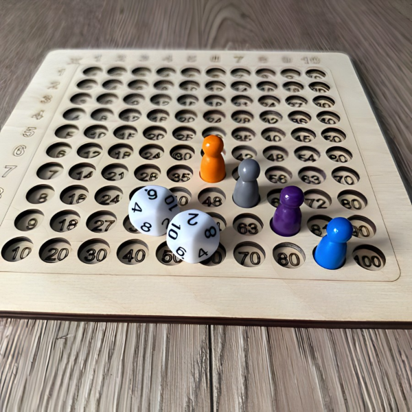 Paket sadrži: 1x drvena ploča s brojevima, 4x figure, 2x kocke s brojevima od 1 do 10, 100x kartica sa zadacima
