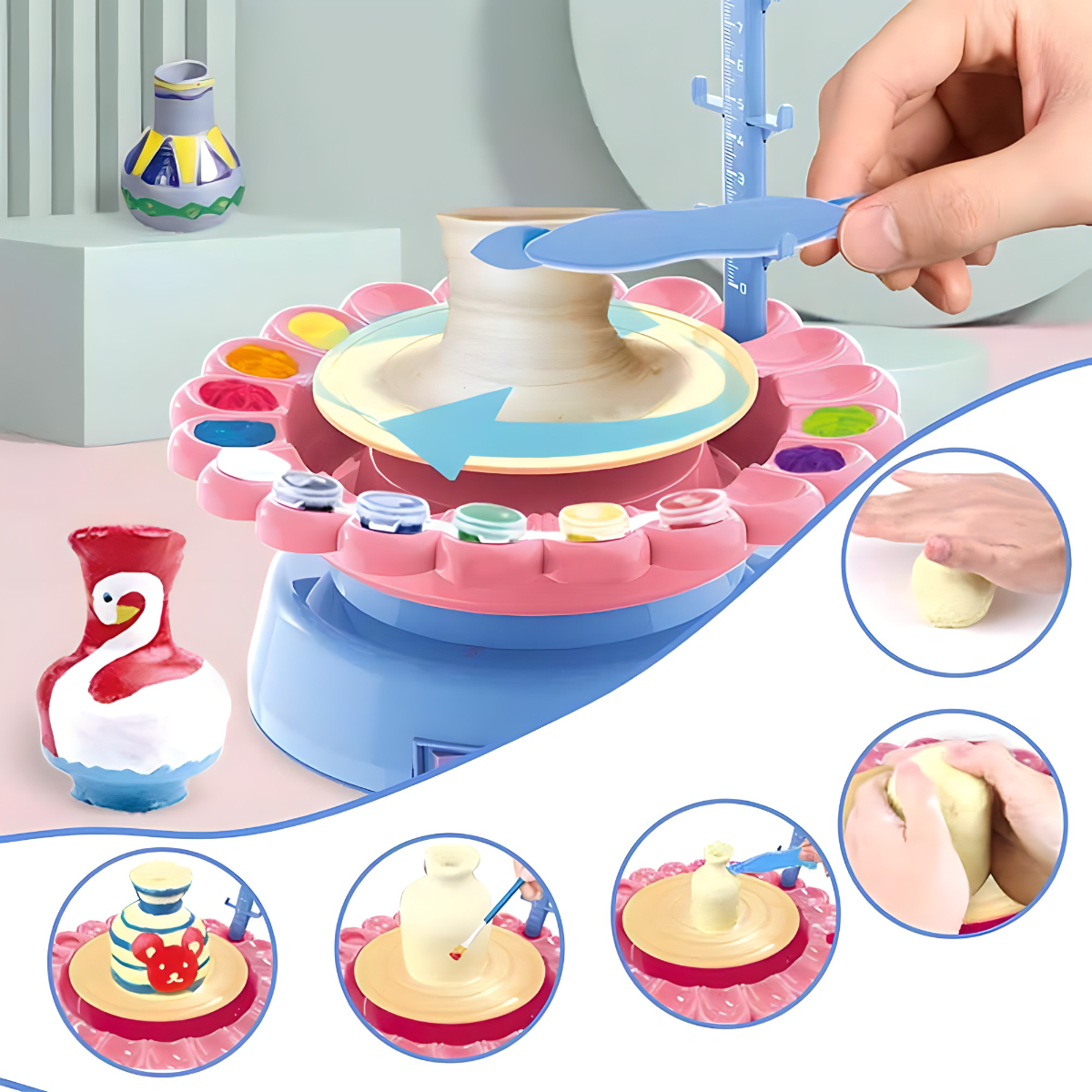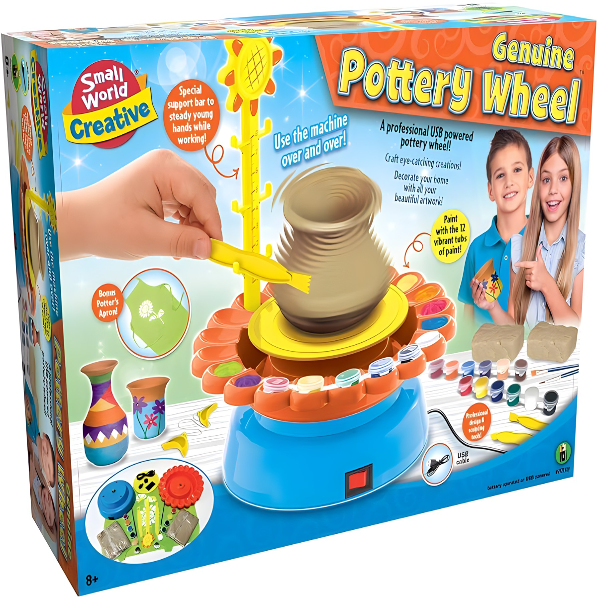 Ne morate kupovati pribor posebno, jer se u ovom setu nalazi rotirajući točak, 12 boja, alat za oblikovanje gline, četkice i keceljica da se u potpunosti postigne umetnički ambijent!