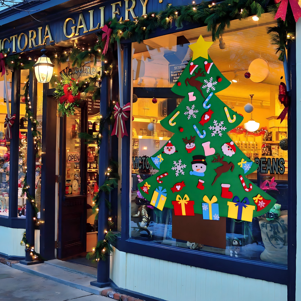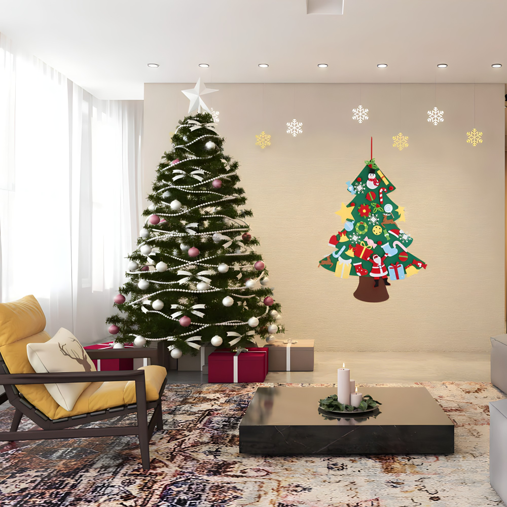 Novogodišnja jelka od filca za zid sa ukrasima je savršeno rešenje! Dizajnirana je za porodice sa decom, domove sa manjkom prostora ili one koji žele nešto drugačije, ali i one koji žele više jelki.