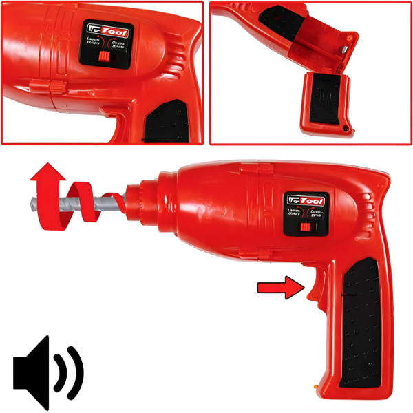 - Veoma realističnu bušilicu koja radi na 2 AA baterije od 1.5 V (nalaze se u setu!) i radi u dva smera (odvrtanje i zavrtanje)